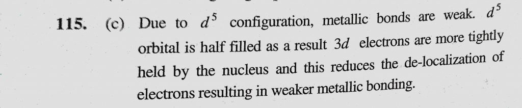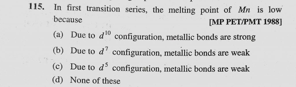 In first transition series, the melting point of Mn is low because (a) Due to d10 configuration, metallic bonds are strong (b) Due to d7 configuration, metallic bonds are weak In first transition series metallic bonds are strong (b) Due to d7 configuration metallic bonds are weak the melting point of Mn is low because (a) Due to d10 configuration November 30, 2020 Category: Uncategorised (JEE Advanced Physics by BM Sharma + GMP Solutions) , Facebook Messenger WhatsApp Share this:TwitterFacebook Related
