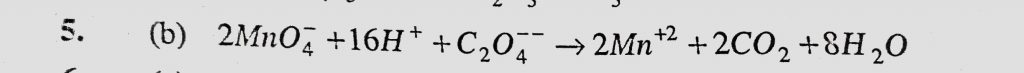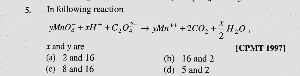 In following reaction yMnO4 – + x H + C2O4 2- to yMn ++ + 2CO2 + x/2 H2O, x and y are (a) 2 and 16 (b) 16 and 2 In following reaction yMnO4 - + x H + C2O4 2- to yMn ++ + 2CO2 + x/2 H2O x and y are (a) 2 and 16 (b) 16 and 2 December 2, 2020 Category: Uncategorised (JEE Advanced Physics by BM Sharma + GMP Solutions) , Facebook Messenger WhatsApp Share this:TwitterFacebook Related