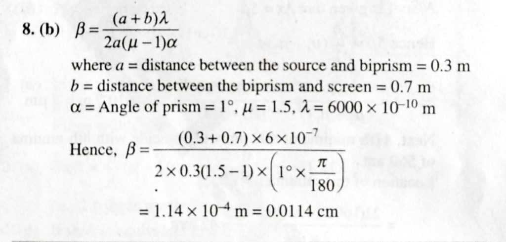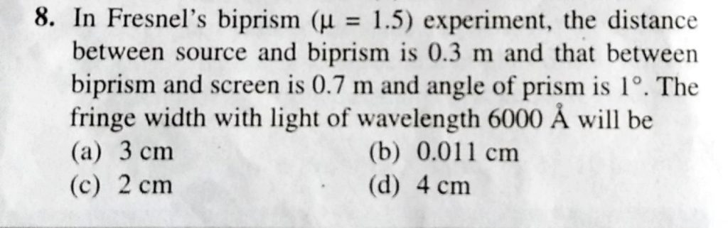 In Fresenl’s biprism ( mu = 1.5 0 experiment, the distance between source and biprism is 3 m and that between biprism and screen is 7 m and angle of prism is 1 degree. The fringe width with light of wave length 6000 A will be In Fresenl's biprism ( mu = 1.5 0 experiment the distance between source and biprism is 3 m and that between biprism and screen is 7 m and angle of prism is 1 degree. The fringe width with light of wave length 6000 A will be September 13, 2020 Category: Uncategorised (JEE Advanced Physics by BM Sharma + GMP Solutions) , Facebook Messenger WhatsApp Share this:TwitterFacebook Related