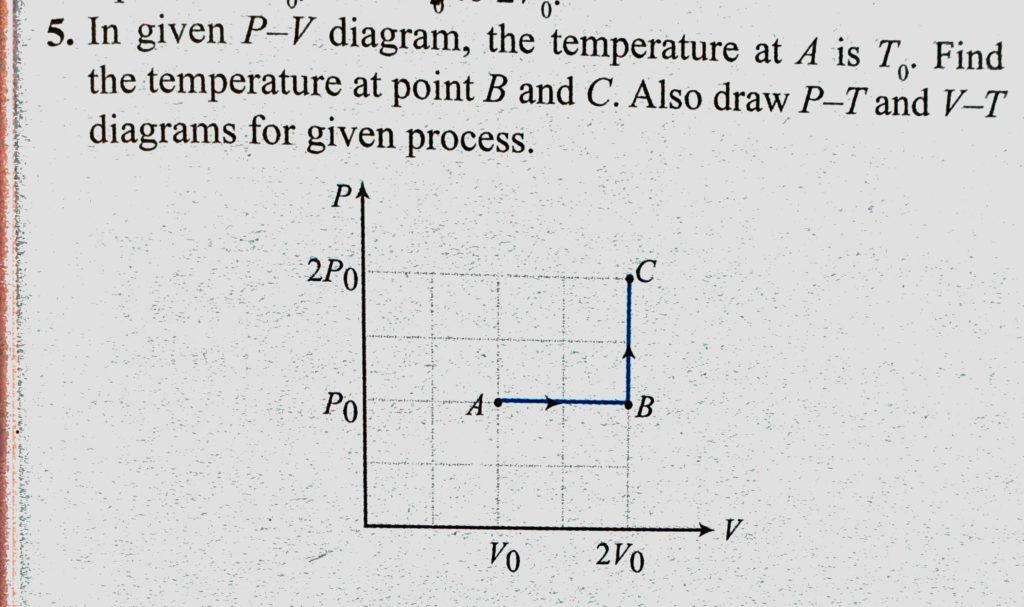 In given P-V diagram, the temperature at A is T0. Find the temperature at point B and C. Also draw P-T and V-T diagrams for given process. In given P-V diagram the temperature at A is T0. Find the temperature at point B and C. Also draw P-T and V-T diagrams for given process. October 27, 2020 Category: Uncategorised (JEE Advanced Physics by BM Sharma + GMP Solutions) , Facebook Messenger WhatsApp Share this:TwitterFacebook Related
