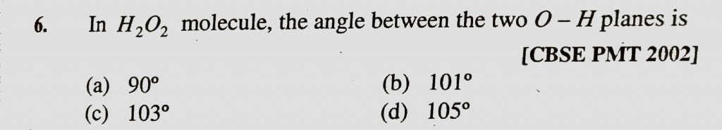 In H2O2 molecule , the angle between the two O – H planes is (a) 90 degree (b) 101 degree (c) 103 degree (d) 105 degree In H2O2 molecule the angle between the two O - H planes is (a) 90 degree (b) 101 degree (c) 103 degree (d) 105 degree December 7, 2020 Category: Uncategorised (JEE Advanced Physics by BM Sharma + GMP Solutions) , Facebook Messenger WhatsApp Share this:TwitterFacebook Related