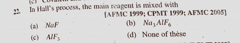 In Hall’s process, the main reagent is mixed with (a) NaF (b) Na3AlF6 (c) AlF3 (d) None of these In Hall's process the main reagent is mixed with (a) NaF (b) Na3AlF6 (c) AlF3 (d) None of these November 17, 2020 Category: Uncategorised (JEE Advanced Physics by BM Sharma + GMP Solutions) , Facebook Messenger WhatsApp Share this:TwitterFacebook Related