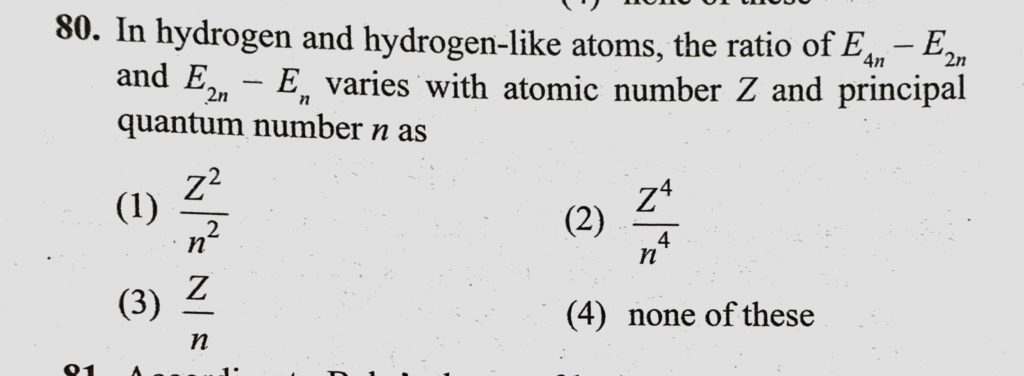 In hydrogen and hydrogen-like atoms, the ratio of E 4n – E 2n and E 2n – En varies with atomic number Z and principal quantum number n as In hydrogen and hydrogen-like atoms the ratio of E 4n - E 2n and E 2n - En varies with atomic number Z and principal quantum number n as October 16, 2020 Category: Uncategorised (JEE Advanced Physics by BM Sharma + GMP Solutions) , Facebook Messenger WhatsApp Share this:TwitterFacebook Related