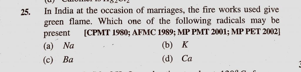 In India at the occasion of marriages, the fire works used give green flame. Which one of the following radicals may be present (a) Na (b) K (c) Ba (d) Ca In India at the occasion of marriages the fire works used give green flame. Which one of the following radicals may be present (a) Na (b) K (c) Ba (d) Ca November 15, 2020 Category: Uncategorised (JEE Advanced Physics by BM Sharma + GMP Solutions) , Facebook Messenger WhatsApp Share this:TwitterFacebook Related