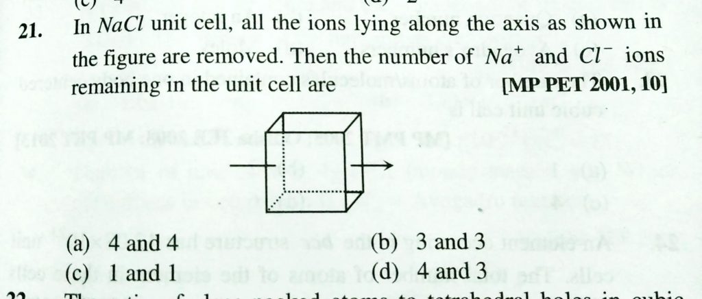 In NaCl unit cell, all the ions lying along the axis as shown in the figure are removed. Then the number of Na^+ and cl^- ions remaining in the unit cell are all the ions lying along the axis as shown in the figure are removed. Then the number of Na^+ and Cl^- ions remaining in the unit cell are In NaCL unit cell February 8, 2021 Category: Uncategorised (JEE Advanced Physics by BM Sharma + GMP Solutions) , Facebook Messenger WhatsApp Share this:TwitterFacebook Related