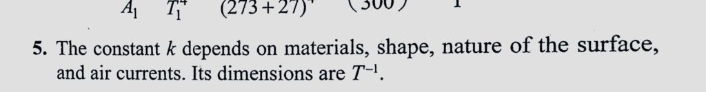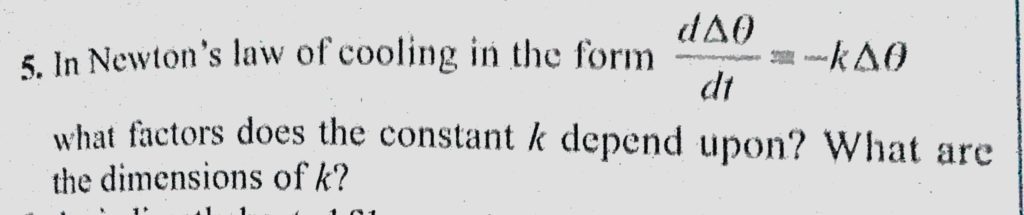 In Newton’s law of cooling in the form d delta theta / dt = -k delta theta what factors does the constant k depend upon ? What are the dimensions of k ? In Newton's law of cooling in the form d delta theta / dt = -k delta theta what factors does the constant k depend upon ? What are the dimensions of k ? October 25, 2020 Category: Uncategorised (JEE Advanced Physics by BM Sharma + GMP Solutions) , Facebook Messenger WhatsApp Share this:TwitterFacebook Related