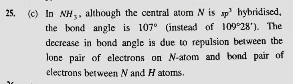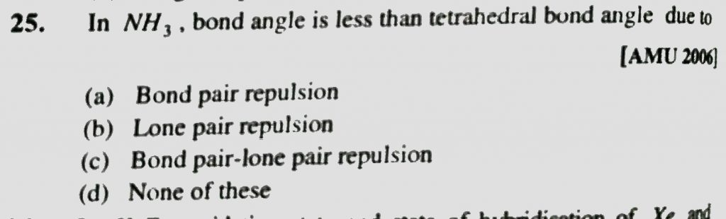In NH3 , bond angle is less than tetrahedral bond angle due to (a) bond pair repulsion (b) lone pair replusion (c) bond pair – lone pair replusion (d) none of these bond angle is less than tetrahedral bond angle due to (a) bond pair repulsion (b) lone pair replusion (c) bond pair - lone pair replusion (d) none of these In NH3 December 7, 2020 Category: Uncategorised (JEE Advanced Physics by BM Sharma + GMP Solutions) , Facebook Messenger WhatsApp Share this:TwitterFacebook Related