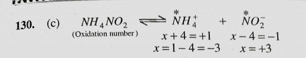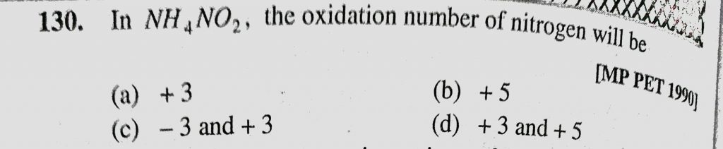 In NH4NO2, the oxidation number of nitrogen will be (a) +3 (b) +5 (c) -3 and +3 (d) +3 and +5 In NH4NO2 the oxidation number of nitrogen will be (a) +3 (b) +5 (c) -3 and +3 (d) +3 and +5 November 23, 2020 Category: Uncategorised (JEE Advanced Physics by BM Sharma + GMP Solutions) , Facebook Messenger WhatsApp Share this:TwitterFacebook Related