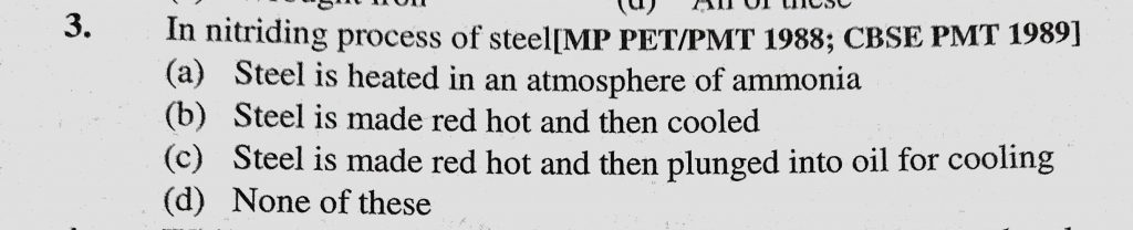 In nitriding process of steel (a) Steel is heated in an atmosphere of ammonia (b) Steel is made red hot and then cooled In nitriding process of steel (a) Steel is heated in an atmosphere of ammonia (b) Steel is made red hot and then cooled November 30, 2020 Category: Uncategorised (JEE Advanced Physics by BM Sharma + GMP Solutions) , Facebook Messenger WhatsApp Share this:TwitterFacebook Related