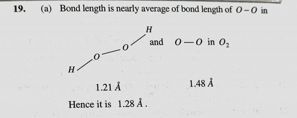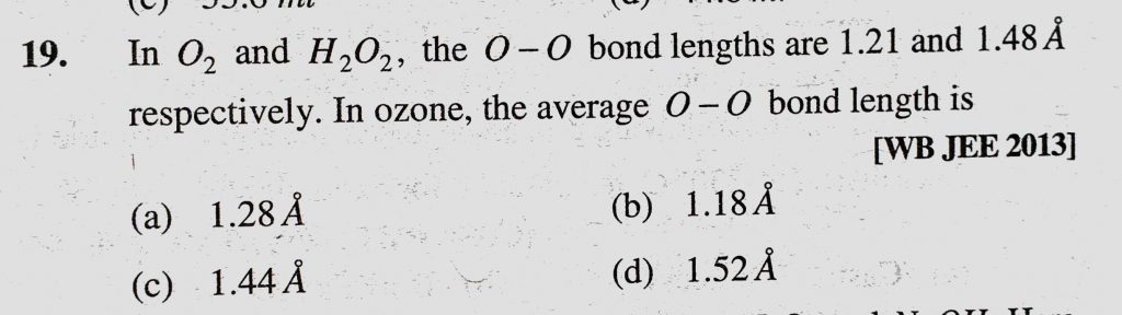 In O2 and H2O2, the O – O bond lengths are 1.21 and 1.48 A respectively. In Ozone, the average O -O bond length is (a) 1.28 A (b) 1.18 A (c) 1.44 A (d) 1.52 A In O2 and H2O2 the average O -O bond length is (a) 1.28 A (b) 1.18 A (c) 1.44 A (d) 1.52 A the O - O bond lengths are 1.21 and 1.48 A respectively. In Ozone November 13, 2020 Category: Uncategorised (JEE Advanced Physics by BM Sharma + GMP Solutions) , Facebook Messenger WhatsApp Share this:TwitterFacebook Related
