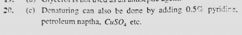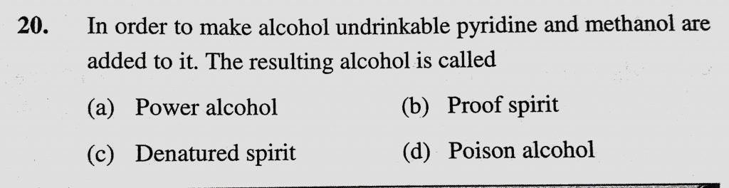 In order to make alcohol undrinkable pyridine and methanol are added to it. The resulting alcohol is called (a) Power alcohol (b) Proof spirit (c) Denatured spirit (d) Poision alcohol In order to make alcohol undrinkable pyridine and methanol are added to it. The resulting alcohol is called (a) Power alcohol (b) Proof spirit (c) Denatured spirit (d) Poision alcohol February 11, 2021 Category: Uncategorised (JEE Advanced Physics by BM Sharma + GMP Solutions) , Facebook Messenger WhatsApp Share this:TwitterFacebook Related