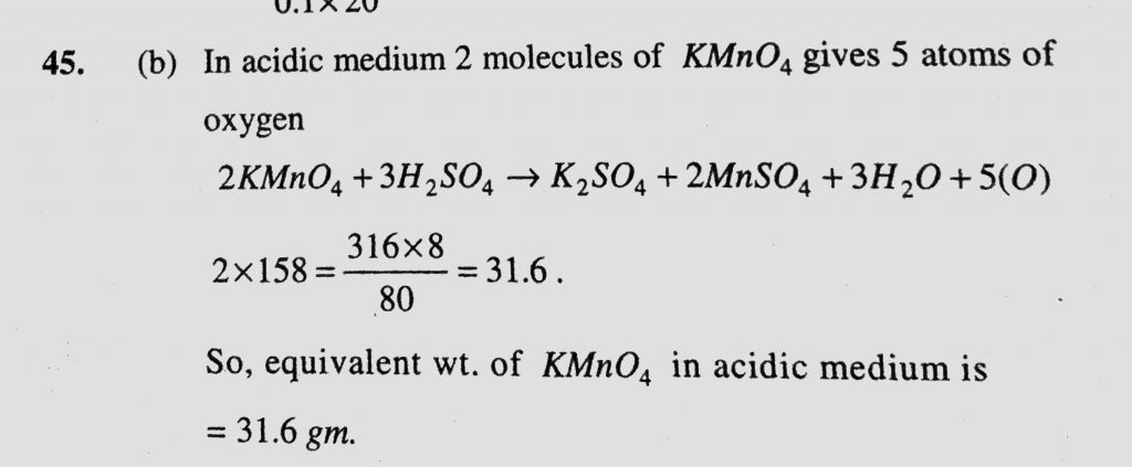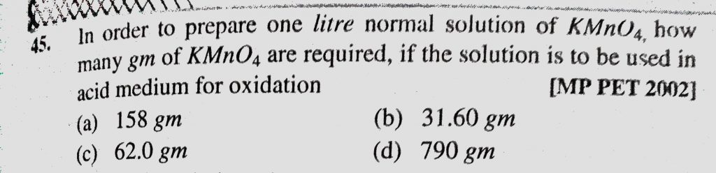 In order to prepare one litre normal solution of KMnO4 how many gm of KMnO4 are required, if the solution is to be used in acid medium for oxidation if the solution is to be used in acid medium for oxidation In order to prepare one litre normal solution of KMnO4 how many gm of KMnO4 are required December 7, 2020 Category: Uncategorised (JEE Advanced Physics by BM Sharma + GMP Solutions) , Facebook Messenger WhatsApp Share this:TwitterFacebook Related