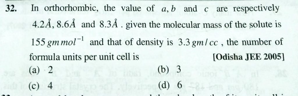 In orthorhombic , the value o0f a, b and c are respectively 4.2 A , 8.6 A and 8.3 A. given the molecular mass of the solute is 155 gm/mol and that of density is 3.3 gm/cc, the number of formula units per unit cell is 8.6 A and 8.3 A. given the molecular mass of the solute is 155 gm/mol and that of density is 3.3 gm/cc b and c are respectively 4.2 Å In orthorhombic the number of formula units per unit cell is the value o0f a February 9, 2021 Category: Uncategorised (JEE Advanced Physics by BM Sharma + GMP Solutions) , Facebook Messenger WhatsApp Share this:TwitterFacebook Related