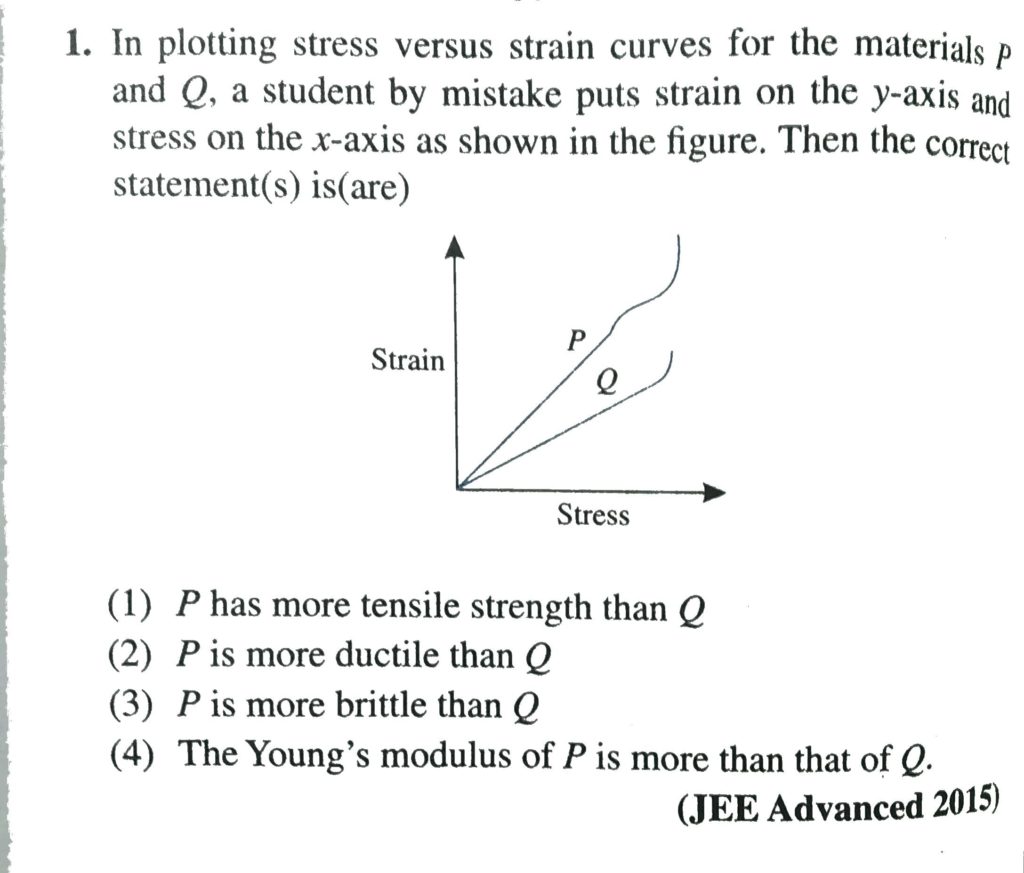 In plotting stress versus strain curves for two material P and Q, a student by mistake puts strain on the y-axis stress on ther x-axis as shown in the figure. Then the correct statement is/are a student by mistake puts strain on the y-axis stress on ther x-axis as shown in the figure. Then the correct statement is/are In plotting stress versus strain curves for two material P and Q October 10, 2020 Category: Uncategorised (JEE Advanced Physics by BM Sharma + GMP Solutions) , Facebook Messenger WhatsApp Share this:TwitterFacebook Related
