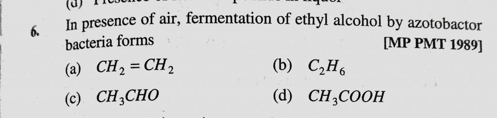 In presence of air, fermentation of ethyl alcohol by azotobactor bacteria forms (a) CH2 = CH2 (b) C2H6 (c) CH3CHO (d) CH3COOH fermentation of ethyl alcohol by azotobactor bacteria forms (a) CH2 = CH2 (b) C2H6 (c) CH3CHO (d) CH3COOH In presence of air February 11, 2021 Category: Uncategorised (JEE Advanced Physics by BM Sharma + GMP Solutions) , Facebook Messenger WhatsApp Share this:TwitterFacebook Related