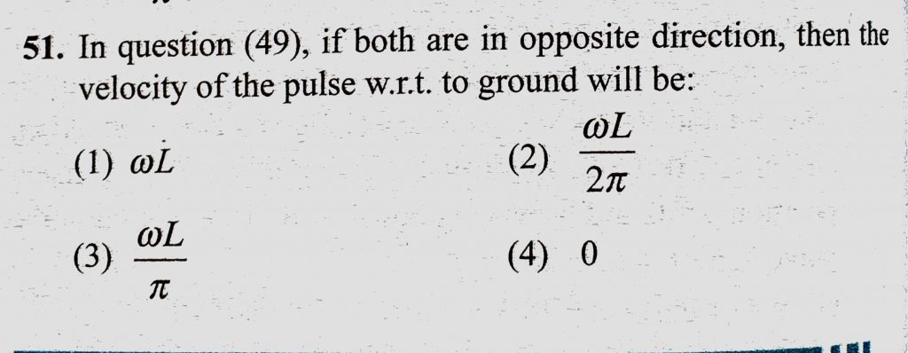 In question (49), if both are in opposite direction, then the velocity of the pulse w.r.t. to ground will be : if both are in opposite direction In question (49) then the velocity of the pulse w.r.t. to ground will be : November 5, 2020 Category: Uncategorised (JEE Advanced Physics by BM Sharma + GMP Solutions) , Facebook Messenger WhatsApp Share this:TwitterFacebook Related