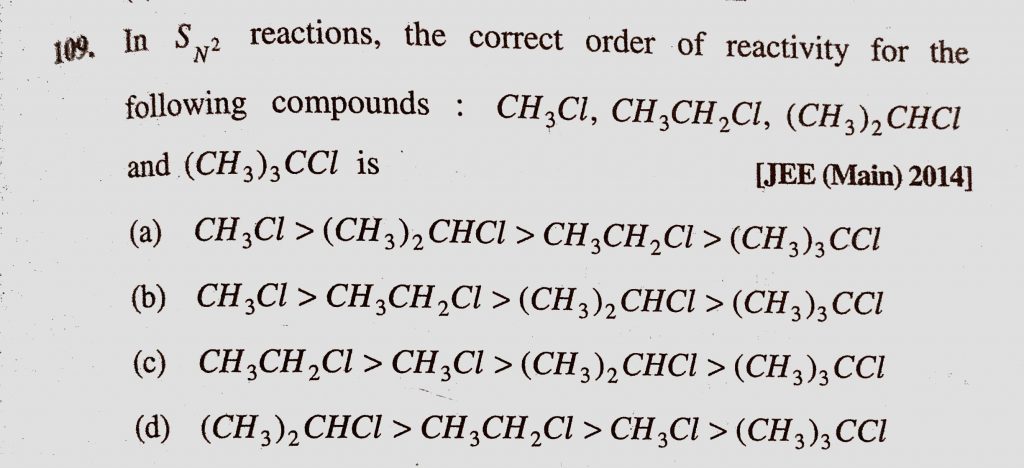 In S N^2 reactions, the correct order of reactivity for the following compounds : CH3Cl, CH3CH2Cl, (CH3)2CHCl and (CH3)3CCl is (CH3)2CHCl and (CH3)3CCl is CH3CH2Cl In S N^2 reactions the correct order of reactivity for the following compounds : CH3Cl December 11, 2020 Category: Uncategorised (JEE Advanced Physics by BM Sharma + GMP Solutions) , Facebook Messenger WhatsApp Share this:TwitterFacebook Related