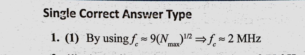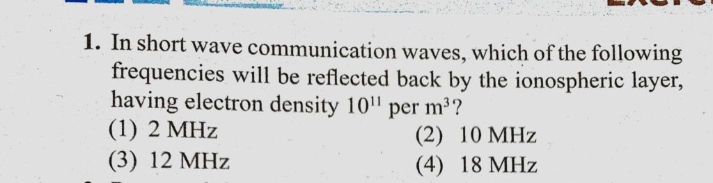 In short wave communication waves, which of the following frequencies will be reflected back by the ionospheric layer, having electron density 10^11 per m^3 ? having electron density 10^11 per m^3 ? In short wave communication waves which of the following frequencies will be reflected back by the ionospheric layer October 22, 2020 Category: Uncategorised (JEE Advanced Physics by BM Sharma + GMP Solutions) , Facebook Messenger WhatsApp Share this:TwitterFacebook Related