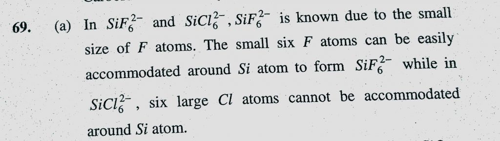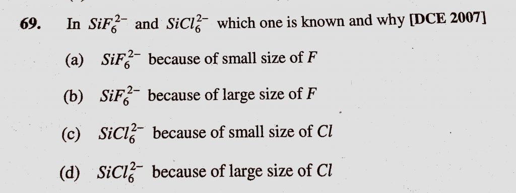 In SiF6 2- and SiCl6 2- which one is known and why (a) SiF6 2- because of small size of F (b) SiF6 2- because of large size of F In SiF6 2- and SiCl6 2- which one is known and why (a) SiF6 2- because of small size of F (b) SiF6 2- because of large size of F November 17, 2020 Category: Uncategorised (JEE Advanced Physics by BM Sharma + GMP Solutions) , Facebook Messenger WhatsApp Share this:TwitterFacebook Related