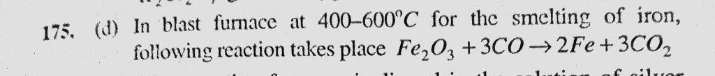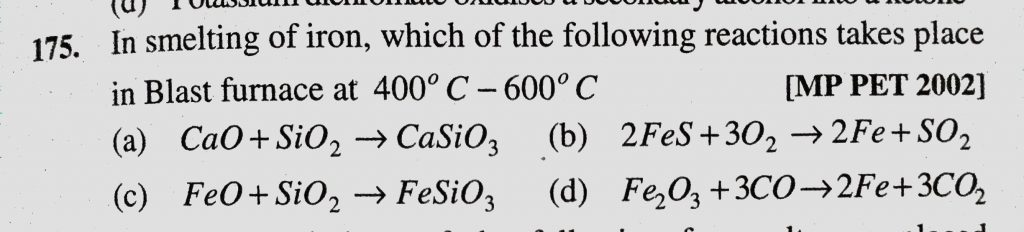 In smelting of iron, which of the following reactions takes place in Blast furnace at 400 C – 600 C (a) CaO + SiO2 to CaSiO3 In smelting of iron which of the following reactions takes place in Blast furnace at 400 C - 600 C (a) CaO + SiO2 to CaSiO3 December 2, 2020 Category: Uncategorised (JEE Advanced Physics by BM Sharma + GMP Solutions) , Facebook Messenger WhatsApp Share this:TwitterFacebook Related