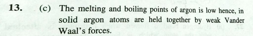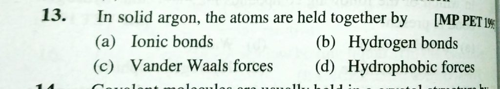 In solid argon , the atoms are held together by (a) Ionic bonds (b) Hydrogen bonds (c) Vander waals forces (d) Hydrophobic forces In solid argon the atoms are held together by (a) Ionic bonds (b) Hydrogen bonds (c) Vander waals forces (d) Hydrophobic forces December 9, 2020 Category: Uncategorised (JEE Advanced Physics by BM Sharma + GMP Solutions) , Facebook Messenger WhatsApp Share this:TwitterFacebook Related