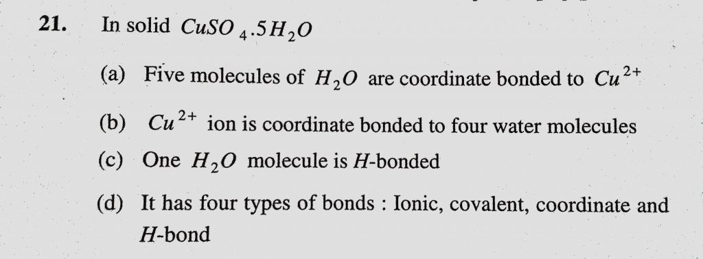 In solid CuSO4.5H2O (a) Five molecules of H2O are coordinate bonded to Cu 2+ (b) Cu 2+ ion is coordinate bonded to four water molecules In solid CuSO4.5H2O (a) Five molecules of H2O are coordinate bonded to Cu 2+ (b) Cu 2+ ion is coordinate bonded to four water molecules December 3, 2020 Category: Uncategorised (JEE Advanced Physics by BM Sharma + GMP Solutions) , Facebook Messenger WhatsApp Share this:TwitterFacebook Related