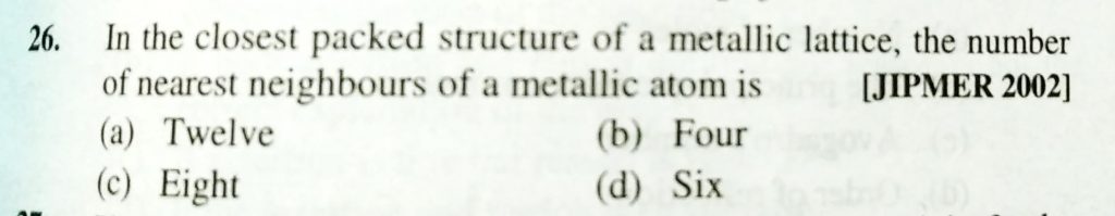 In teh closest packed structure of a metallic lattice, the number of nearest neighbours of a metallic atom is In teh closest packed structure of a metallic lattice the number of nearest neighbours of a metallic atom is December 16, 2020 Category: Uncategorised (JEE Advanced Physics by BM Sharma + GMP Solutions) , Facebook Messenger WhatsApp Share this:TwitterFacebook Related