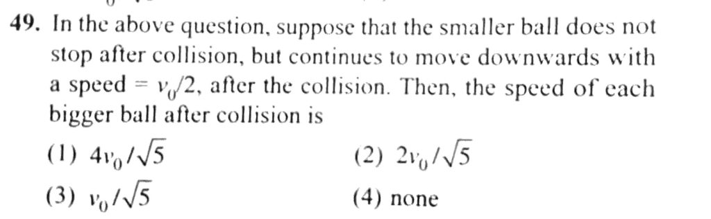 In the above, suppose that the smaller ball does not stop after collision, but continues to move downwards with a speed = υ0 / 2 after the collision. Then, the speed of each bigger ball after collision is but continues to move downwards with a speed = υ0 / 2 after the collision. Then In the above suppose that the smaller ball does not stop after collision the speed of each bigger ball after collision is September 24, 2020 Category: Uncategorised (JEE Advanced Physics by BM Sharma + GMP Solutions) , Facebook Messenger WhatsApp Share this:TwitterFacebook Related
