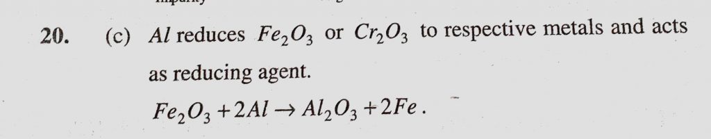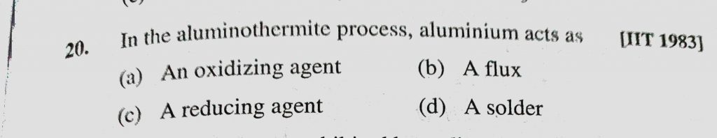 In the aluminothermite process, aluminium acts as (a) An oxidizing agent (b) A flux (c) A reducing agent (d) A solder aluminium acts as (a) An oxidizing agent (b) A flux (c) A reducing agent (d) A solder In the aluminothermite process November 12, 2020 Category: Uncategorised (JEE Advanced Physics by BM Sharma + GMP Solutions) , Facebook Messenger WhatsApp Share this:TwitterFacebook Related