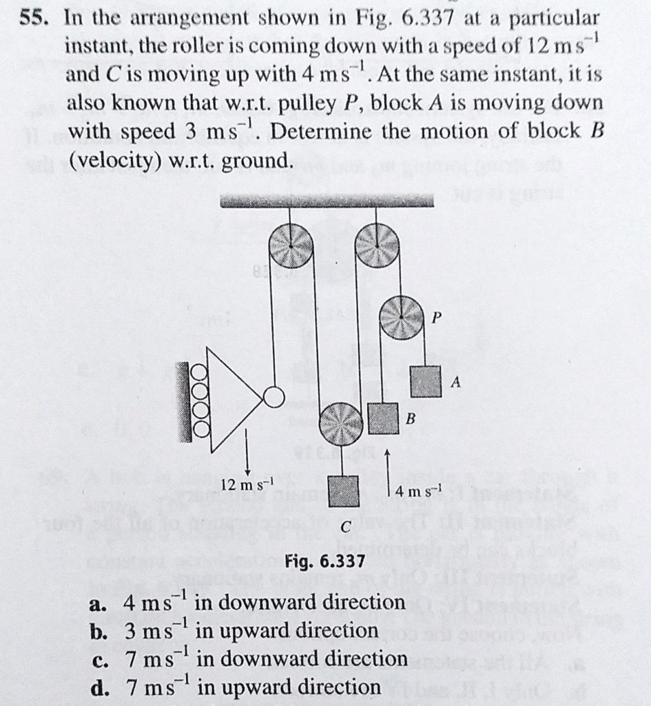 In the arrangement shown in Fig. 6.337 at a particular instant, the roller is coming down with a speed of 12 m/s and C is moving up with 4 m/s. At the same instant, it is also known that In the arrangement shown in Fig. 6.337 at a particular instant it is also known that the roller is coming down with a speed of 12 m/s and C is moving up with 4 m/s. At the same instant September 29, 2020 Category: Uncategorised (JEE Advanced Physics by BM Sharma + GMP Solutions) , Facebook Messenger WhatsApp Share this:TwitterFacebook Related