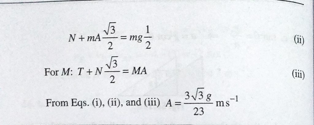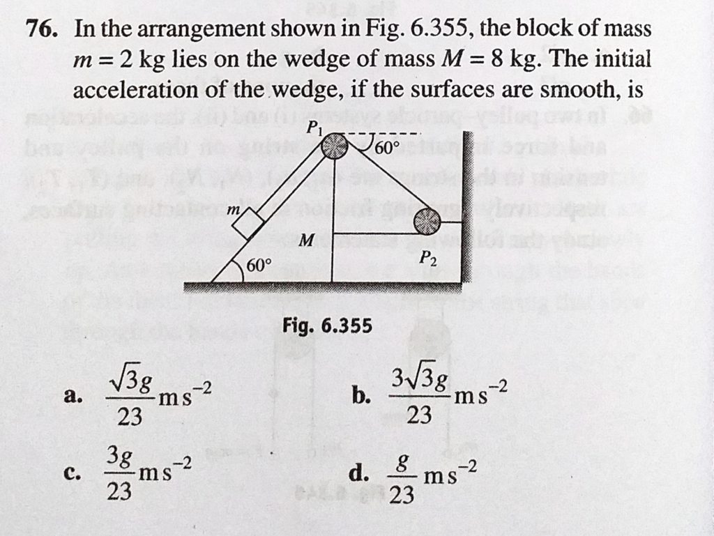 In the arrangement shown in Fig. 6.355, the block of mass m = 2 kg lies on the wedge of mass M = 8 kg. The initial acceleration of the wedge, if the surfaces are smooth is if the surfaces are smooth is In the arrangement shown in Fig. 6.355 the block of mass m = 2 kg lies on the wedge of mass M = 8 kg. The initial acceleration of the wedge September 29, 2020 Category: Uncategorised (JEE Advanced Physics by BM Sharma + GMP Solutions) , Facebook Messenger WhatsApp Share this:TwitterFacebook Related