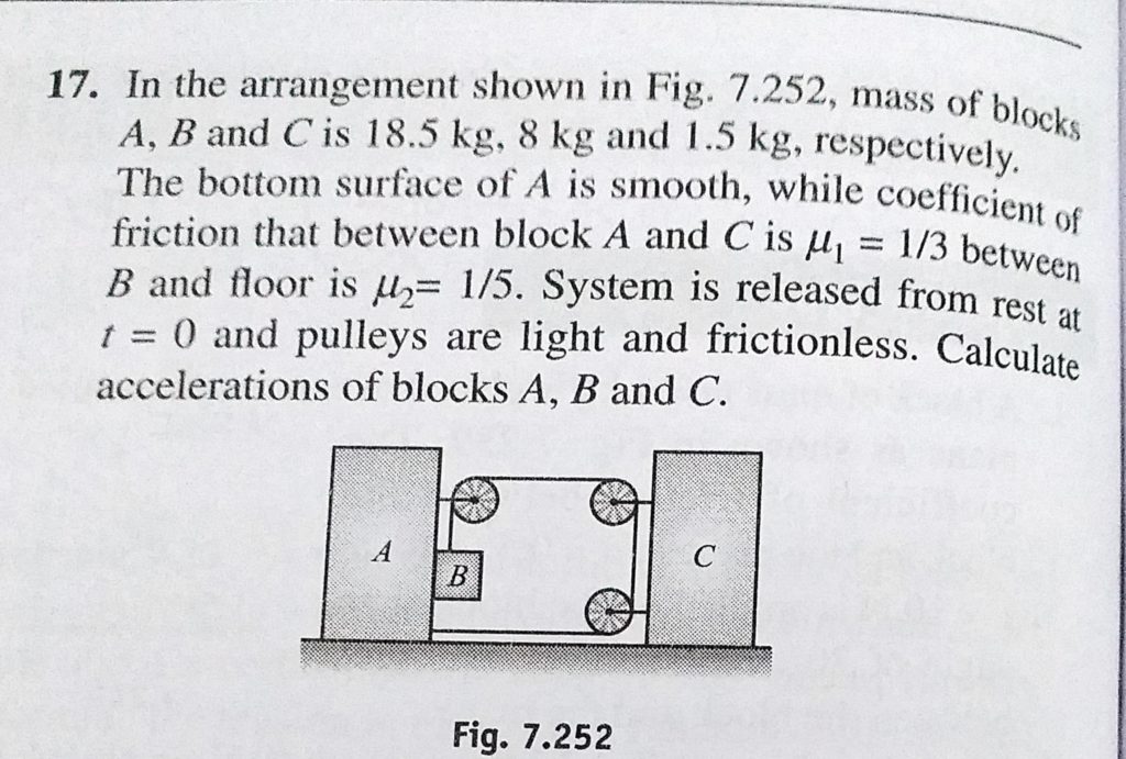 In the arrangement shown in Fig. 7.252, mass of blocks A, B and C is 18.5 kg, 8 kg and 1.5 kg, respectively. The bottom surface of A is smooth, while coefficient of friction that between block A and C is muon 1 = 1/3 8 kg and 1.5 kg B and C is 18.5 kg In the arrangement shown in Fig. 7.252 mass of blocks A respectively. The bottom surface of A is smooth while coefficient of friction that between block A and C is muon 1 = 1/3 September 30, 2020 Category: Uncategorised (JEE Advanced Physics by BM Sharma + GMP Solutions) , Facebook Messenger WhatsApp Share this:TwitterFacebook Related