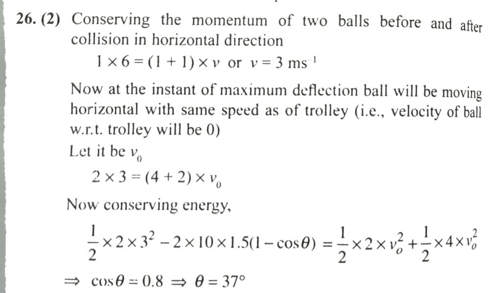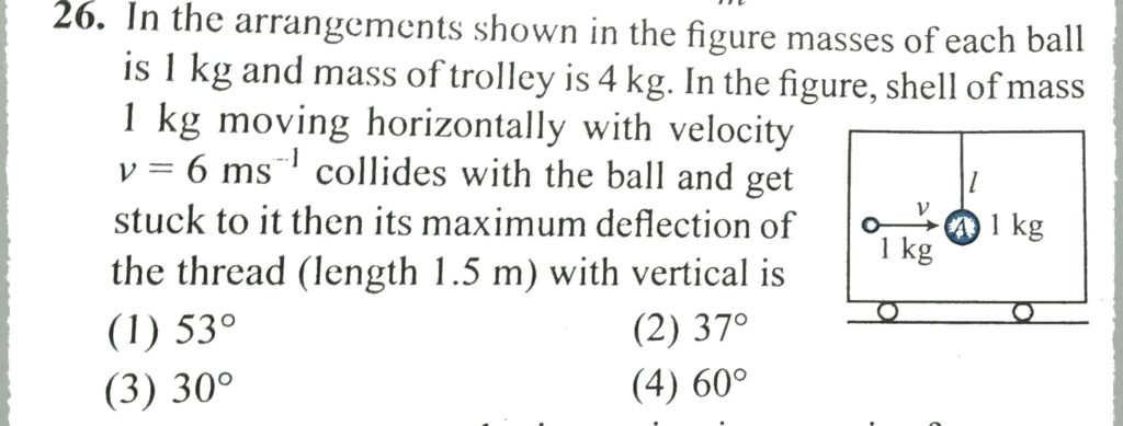 In the arrangements shown in the figure masses of each ball is 1 kg and mass of trolley is 4 kg. In the figure, shell of mass 1 kg moving horizontally with velocity v = 6 m/s collides with the ball and get stuck to it then its maximum deflection of the thread (length 1.5 m) with vertical