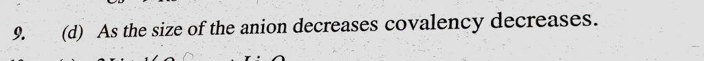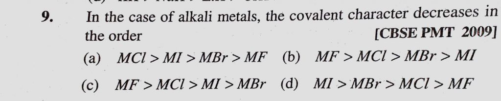 In the case of alkali metals, the covalent character decreases in the order (a) MCl < MI MF (b) MF > MCl > MBr > MI In the case of alkali metals the covalent character decreases in the order (a) MCl < MI MF (b) MF > MCl > MBr > MI November 13, 2020 Category: Uncategorised (JEE Advanced Physics by BM Sharma + GMP Solutions) , Facebook Messenger WhatsApp Share this:TwitterFacebook Related