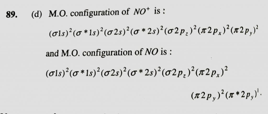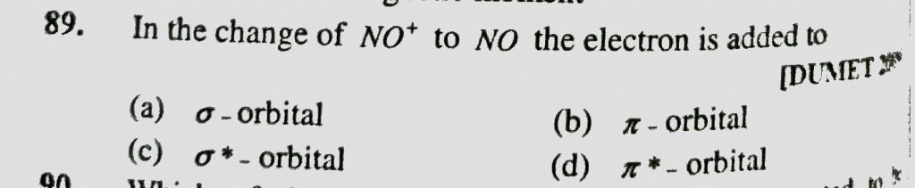 In the change of NO^+ to NO the electron is added to (a) sigma – orbital (b) pie – orbital (c) sigma* – orbital (d) pie * – orbital In the change of NO^+ to NO the electron is added to (a) sigma - orbital (b) pie - orbital (c) sigma* - orbital (d) pie * - orbital December 8, 2020 Category: Uncategorised (JEE Advanced Physics by BM Sharma + GMP Solutions) , Facebook Messenger WhatsApp Share this:TwitterFacebook Related