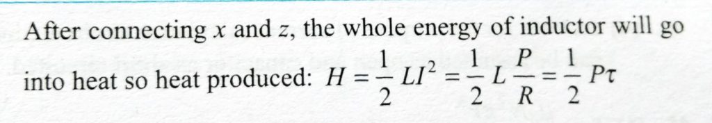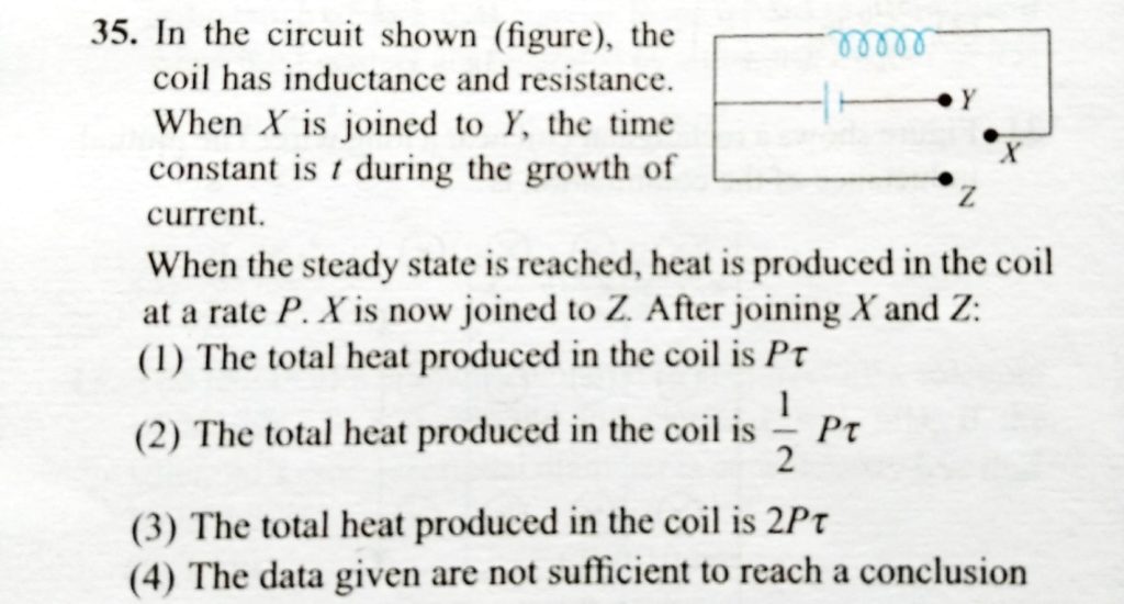 In the circuit shows Fig the coil has inductance and resistance. When X is joined to Y, the time constant is t during the growth of current. When the steady state is reached, heat is produced in the coil at a rate P. X is now joined to Z. After joining X and Z: