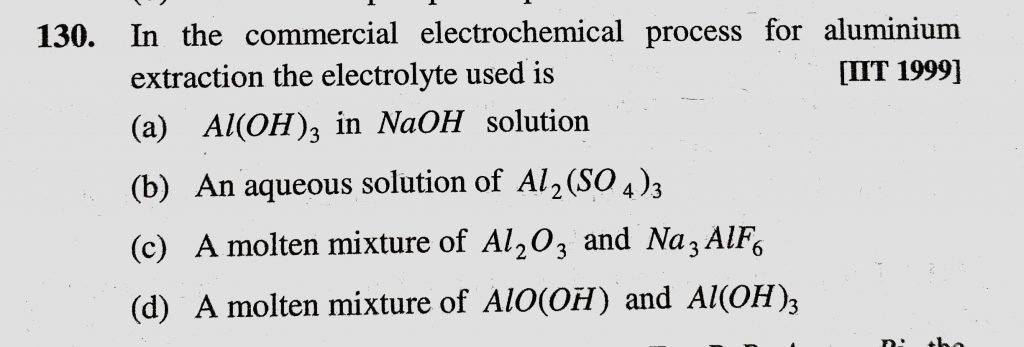 In the commercial electrochemical process for aluminium extraction the electrolyte used is (a) Al(OH)3 in NaOH solution In the commercial electrochemical process for aluminium extraction the electrolyte used is (a) Al(OH)3 in NaOH solution November 27, 2020 Category: Uncategorised (JEE Advanced Physics by BM Sharma + GMP Solutions) , Facebook Messenger WhatsApp Share this:TwitterFacebook Related