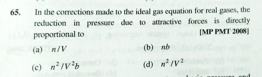 In the correction made to the ideal gas equation for real gases, the reduction in pressure due to attractive forces is directly proportional to In the correction made to the ideal gas equation for real gases the reduction in pressure due to attractive forces is directly proportional to February 11, 2021 Category: Uncategorised (JEE Advanced Physics by BM Sharma + GMP Solutions) , Facebook Messenger WhatsApp Share this:TwitterFacebook Related