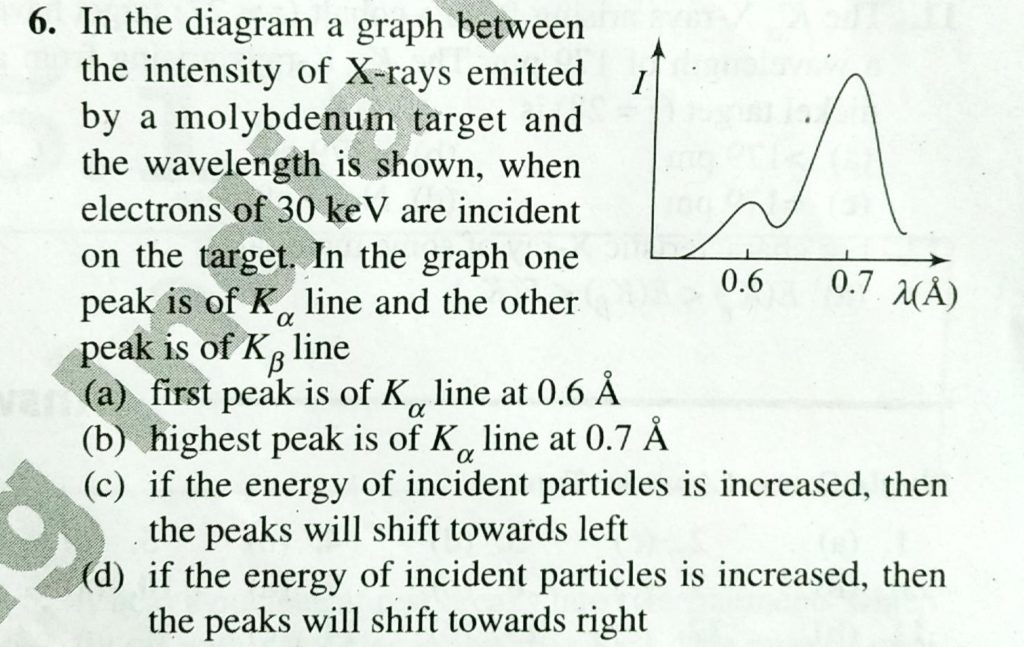 In the diagram a graph between the intensity of X-rays emitted by a molybdenum target and the wavelength is shown, when electrons of 30 keV are incident on the target. In the graph one peak is of Kα line and the other peak is of Kβ line In the diagram a graph between the intensity of X-rays emitted by a molybdenum target and the wavelength is shown when electrons of 30 keV are incident on the target. In the graph one peak is of Kα line and the other peak is of Kβ line September 14, 2020 Category: Uncategorised (JEE Advanced Physics by BM Sharma + GMP Solutions) , Facebook Messenger WhatsApp Share this:TwitterFacebook Related