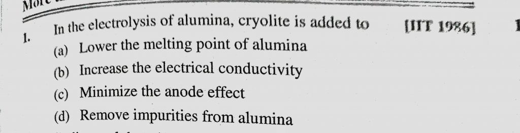 In the electrolysis of alumina, cryolite is added to (a) Lower the melting point of alumina (b) Increase the electrical conductivity cryolite is added to (a) Lower the melting point of alumina (b) Increase the electrical conductivity In the electrolysis of alumina November 28, 2020 Category: Uncategorised (JEE Advanced Physics by BM Sharma + GMP Solutions) , Facebook Messenger WhatsApp Share this:TwitterFacebook Related