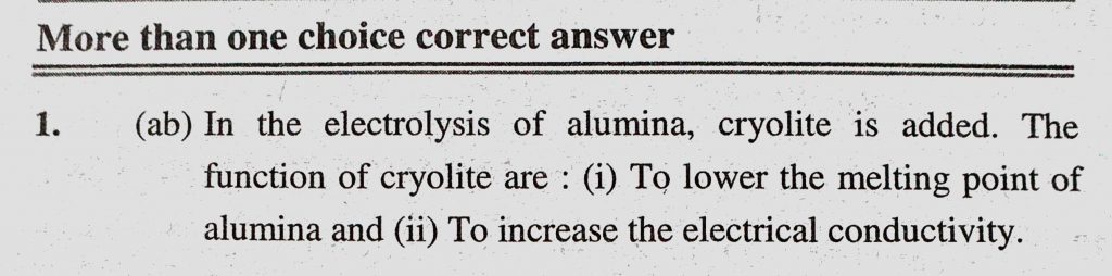 In the electrolysis of alumina, cryolite is added to (a) Lower the melting point of alumina (b) Increase the electrical conductivity cryolite is added to (a) Lower the melting point of alumina (b) Increase the electrical conductivity In the electrolysis of alumina November 12, 2020 Category: Uncategorised (JEE Advanced Physics by BM Sharma + GMP Solutions) , Facebook Messenger WhatsApp Share this:TwitterFacebook Related