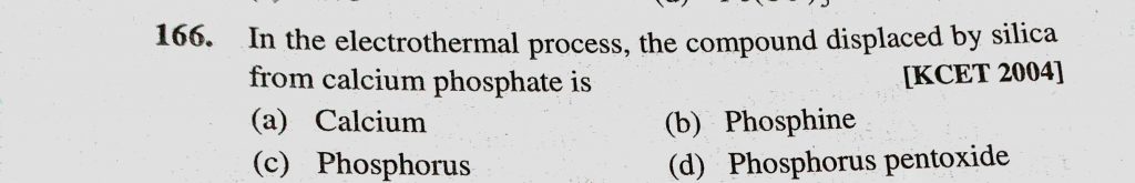In the electrothermal process, the compound displaced by silica from calcium phosphate is (a) Calcium (b) Phosphine (c) Phosphorus In the electrothermal process the compound displaced by silica from calcium November 23, 2020 Category: Uncategorised (JEE Advanced Physics by BM Sharma + GMP Solutions) , Facebook Messenger WhatsApp Share this:TwitterFacebook Related