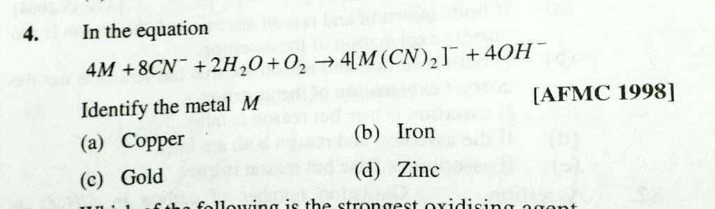 In the equation 4M +8CN^- 2H2O +O2 gives 4[M (CN 2 ]6- +4OH^- Identify the metal M In the equation 4M +8CN^- 2H2O +O2 gives 4[M (CN 2 ]6- +4OH^- Identify the metal M November 24, 2020 Category: Uncategorised (JEE Advanced Physics by BM Sharma + GMP Solutions) , Facebook Messenger WhatsApp Share this:TwitterFacebook Related