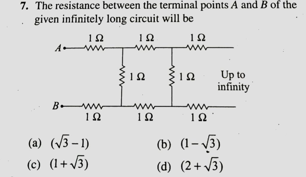 The resistance between the terminals points A and B of the given infinitely long circuit will be The resistance between the terminals points A and B of the given infinitely long circuit will be September 19, 2020 Category: Uncategorised (JEE Advanced Physics by BM Sharma + GMP Solutions) , Facebook Messenger WhatsApp Share this:TwitterFacebook Related