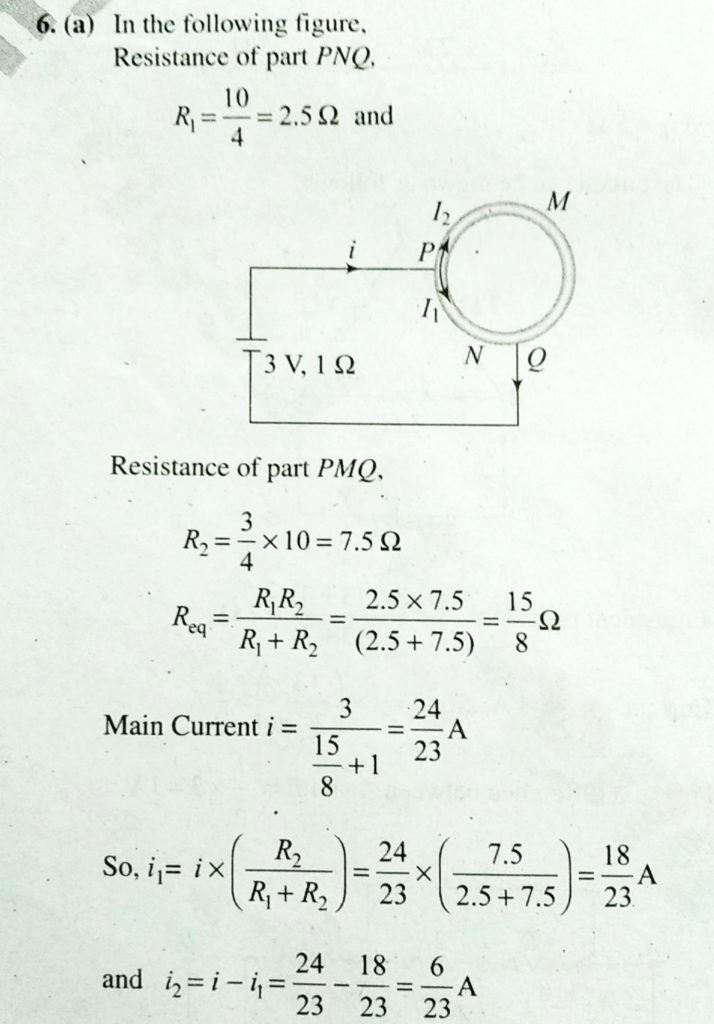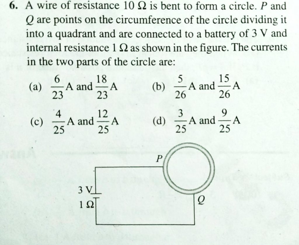 A wire of resistance 10 Ω is bent to form a circle. P and Q are points on the circumference of the circle dividing it into a quadrant and are connected to a Battery of 3 V and internal resistance 1Ω as shown in the figure. The currents in the two parts of the circle are