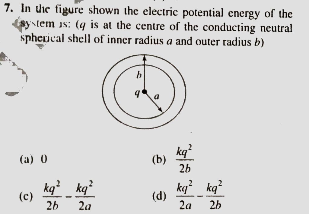 In the figure shown the electric potential energy of the system is ( q is at the centre of the conducting neutral spherical shell of inner radius a and outer radius b ) In the figure shown the electric potential energy of the system is ( q is at the centre of the conducting neutral spherical shell of inner radius a and outer radius b ) September 18, 2020 Category: Uncategorised (JEE Advanced Physics by BM Sharma + GMP Solutions) , Facebook Messenger WhatsApp Share this:TwitterFacebook Related