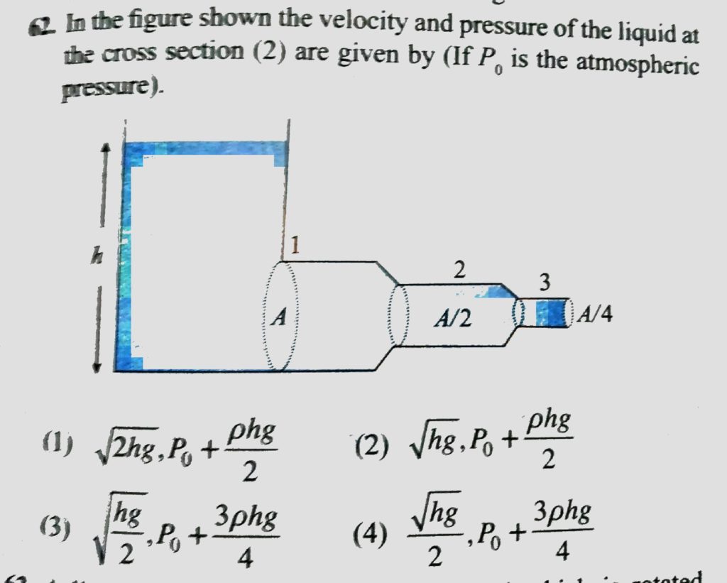 In the figure shown the velocity and pressure of the liquid at the cross section ( 2 ) are given by ( If p0 is the atmospheric pressure ). In the figure shown the velocity and pressure of the liquid at the cross section ( 2 ) are given by ( If p0 is the atmospheric pressure ). October 8, 2020 Category: Uncategorised (JEE Advanced Physics by BM Sharma + GMP Solutions) , Facebook Messenger WhatsApp Share this:TwitterFacebook Related