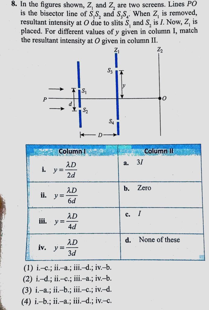 In the figures shown, Z1 and Z2 are two screens. Lines PO is the bisector line of S1S2 and S3S4. When Z1 is removed, resultant intensity at O due to slits S1 and S2 is I. Now, Z1 is In the figures shown resultant intensity at O due to slits S1 and S2 is I. Now Z1 and Z2 are two screens. Lines PO is the bisector line of S1S2 and S3S4. When Z1 is removed Z1 is October 11, 2020 Category: Uncategorised (JEE Advanced Physics by BM Sharma + GMP Solutions) , Facebook Messenger WhatsApp Share this:TwitterFacebook Related