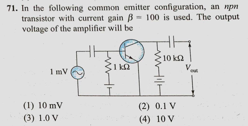 In the following common emitter configuration, an npn transistor with current gain beta = 100 is used. The output voltage of the amplifier will be an npn transistor with current gain beta = 100 is used. The output voltage of the amplifier will be In the following common emitter configuration October 22, 2020 Category: Uncategorised (JEE Advanced Physics by BM Sharma + GMP Solutions) , Facebook Messenger WhatsApp Share this:TwitterFacebook Related