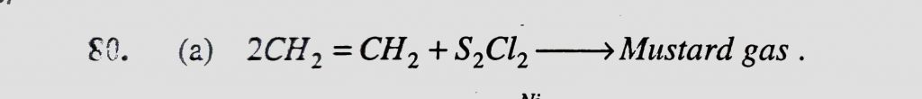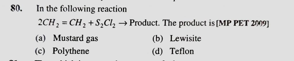 In the following reaction 2CH2=CH2 + S2Cl2 to Product. The product is (a) Mustard gas (b) Lewisite (c) Polythene (d) Teflon In the following reaction 2CH2=CH2 + S2Cl2 to Product. The product is (a) Mustard gas (b) Lewisite (c) Polythene (d) Teflon December 13, 2020 Category: Uncategorised (JEE Advanced Physics by BM Sharma + GMP Solutions) , Facebook Messenger WhatsApp Share this:TwitterFacebook Related